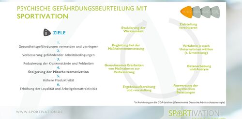 Im Arbeitsschutzgesetz §5 wird die Berücksichtigung psychischer Belastungen in der Gefährdungsbeurteilung seit 2013 explizit gefordert. SPORTIVATION hilft Ihrem Unternehmen bei der gesetzeskonformen Umsetzung und begleitet Sie im gesamten Prozess. Mit unserem interdisziplinären Team aus Psychologen, Gesundheitsmanagern und Sportwissenschaftlern bieten wir Ihnen ein ganzheitliches, lösungsorientiertes Paket.