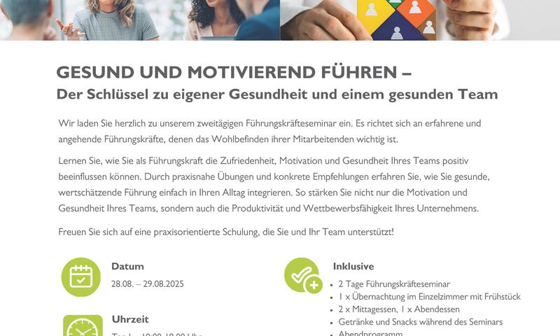 Unser zweitägiges Führungskräfteseminar richtet sich sowohl an erfahrene Führungskräfte und Unternehmer, als auch an junge und angehende Führungskräfte, denen das Wohlbefinden ihrer Mitarbeitenden am Herzen liegt.